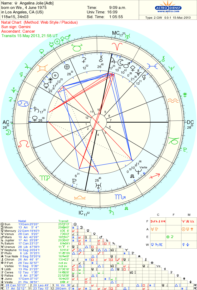 מפת הלידה של אנג'לינה ג'ולי – באופק 28 מעלות במזל סרטן – סמל האימהות. במעלה ה-29 [בנקודת האופק ממוקם כוכב שבת Aludra בעל אופי של ונוס[טווח ההשפעה] 2.4 מגניטודה. כוכב השבת Aludra ממוקם בקונסטלציית הכלב הגדול על זנבו השפעת וונוס על לב רחום, נתינה וטוב לב, בעלי תשוקה עזה עם נטילת סיכונים גדולים אך קשור לקלף הניצחון בטארוט.
