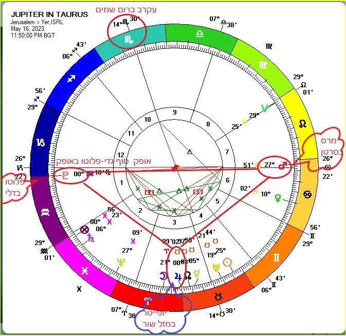 יופיטר מגיע למזל שור ב: 16.5.23 בשעה 23:50 על פי שעון ישראל. אופק המפה 25.40 במזל גדי מרכז השמים 14 מעלות במזל עקרב.